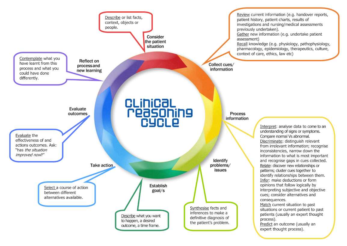 | Discriminate: distinguish relevant from irrelevant information; recognize inconsistencies, narrow down the information to what is most important, and recognize gaps in cues collected | • His temp is up a bit, but I'm not too worried about it - I'm more concerned about his BP and pulse • I'd better check his urine output and his O2 sats |