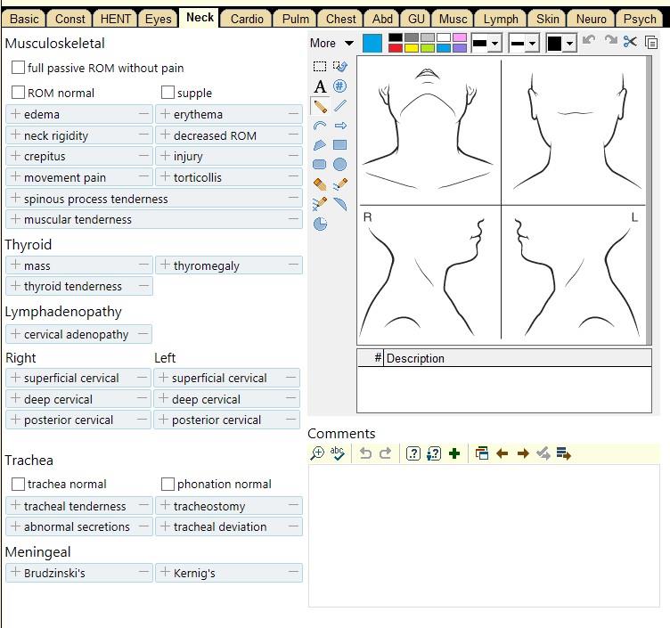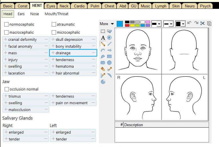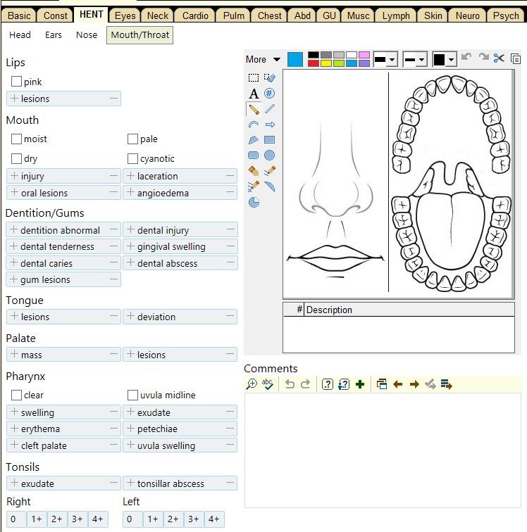 [ ] normal hearing bilaterally [ ] no nasal discharge [ ] proper dentition [ ] moist mucous membranes [ ] no erythema [ ] no exudate [ ] no lymphadenopathy [ ] trachea midline |