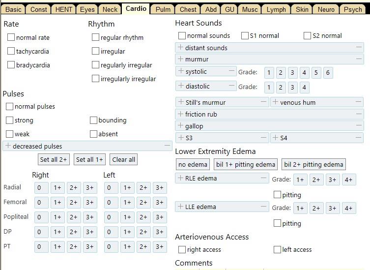 [ ] regular rate / rhythm [ ] no murmurs / rubs / gallops [ ] normal distal pulses [ ] no JVD [ ] normal capillary refill [ ] no leg edema [ ] no varicose veins |