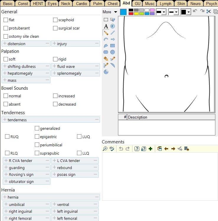 [ ] normal bowel sounds [ ] no aortic / renal bruits [ ] normal percussion [ ] abdomen soft / non-tender [ ] no distension / fluid [ ] no hepatomegaly [ ] no splenomegaly |