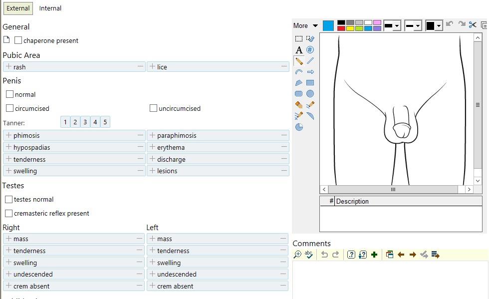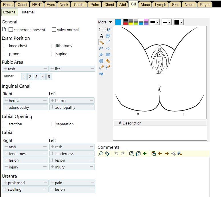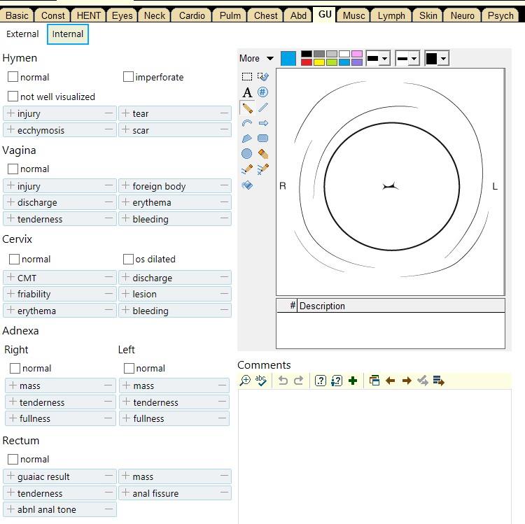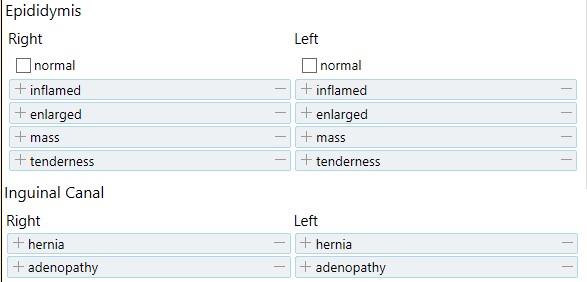[ ] no hernias [ ] no cuts / lesions [ ] no rashes / ulcers [ ] no lymphadenopathy [ ] no discharge [ ] no bleeding [ ] no masses / induration Male: [ ] no scrotal masses [ ] no testicular swelling [ ] normal cremaster reflex Female: [ ] normal speculum exam [ ] normal bimanual exam |
