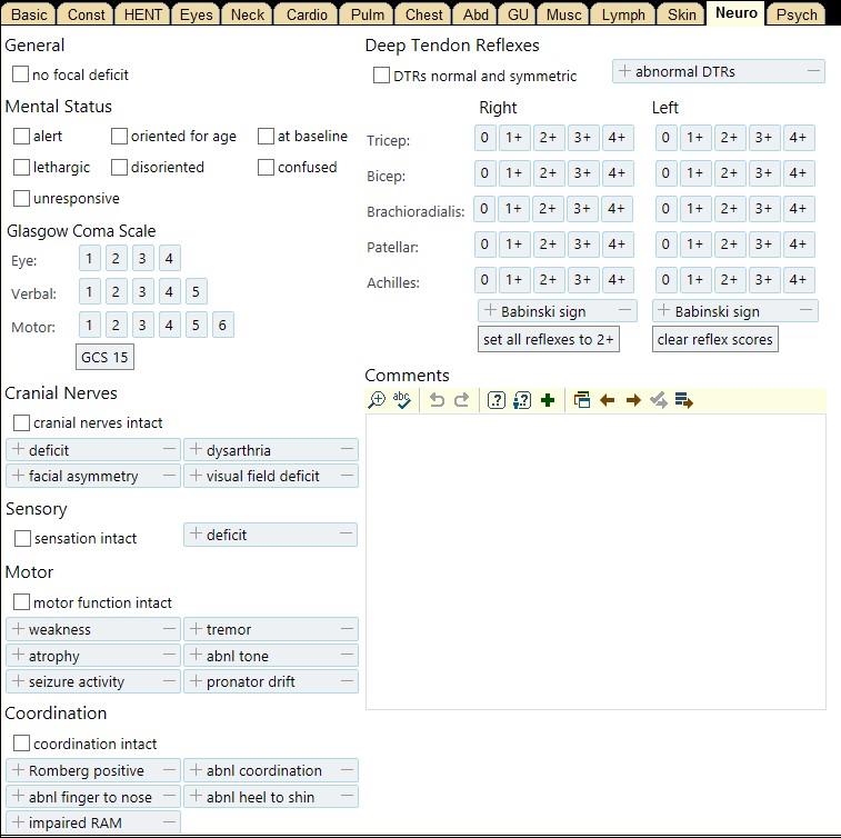 | Cranial Nerves | Strength | Reflexes | Sensation | Cerebellar |
