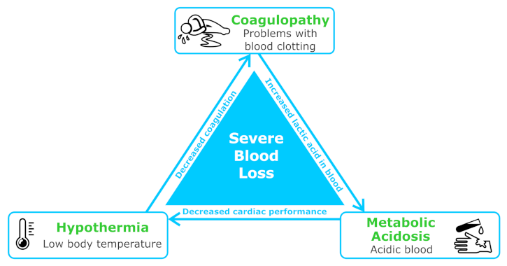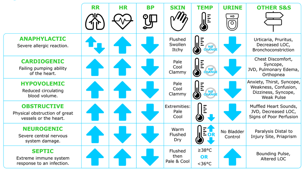| Hypovolemic Shock | "fluid problem" | Bleeding out from a hemorrhage, whether internally or externally; lacking sodium and water due to dehydration from excess vomiting, diarrhea, or sweating like in foodborne illnesses or heat stroke |