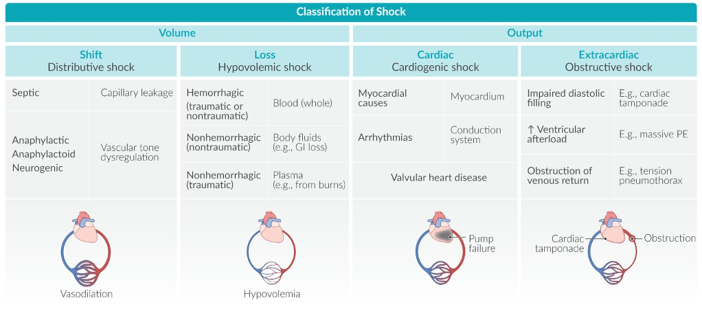 | Distributive Shock | "pipe problem" | During anaphylaxis, the blood vessels rapidly dilate and blood pressure drops; notice the similarities to immune response during sepsis; most common type of shock (~66% of cases) |