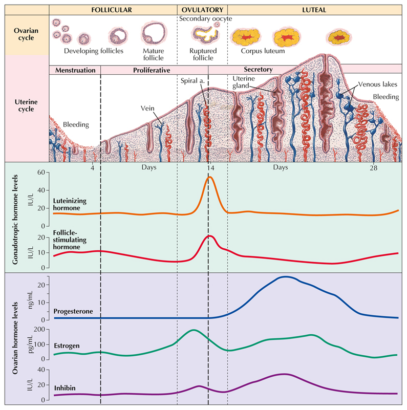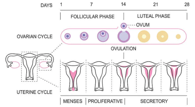 approx. 3-7 days long | This is the phase that everyone is familiar with. It is when the endometrium, or uterine lining, starts to shed. It begins the first day of full bleeding. On average, about 25-80 milliliters of blood is lost. For reference, a fully soaked regular tampon/pad holds ~5 milliliters. |